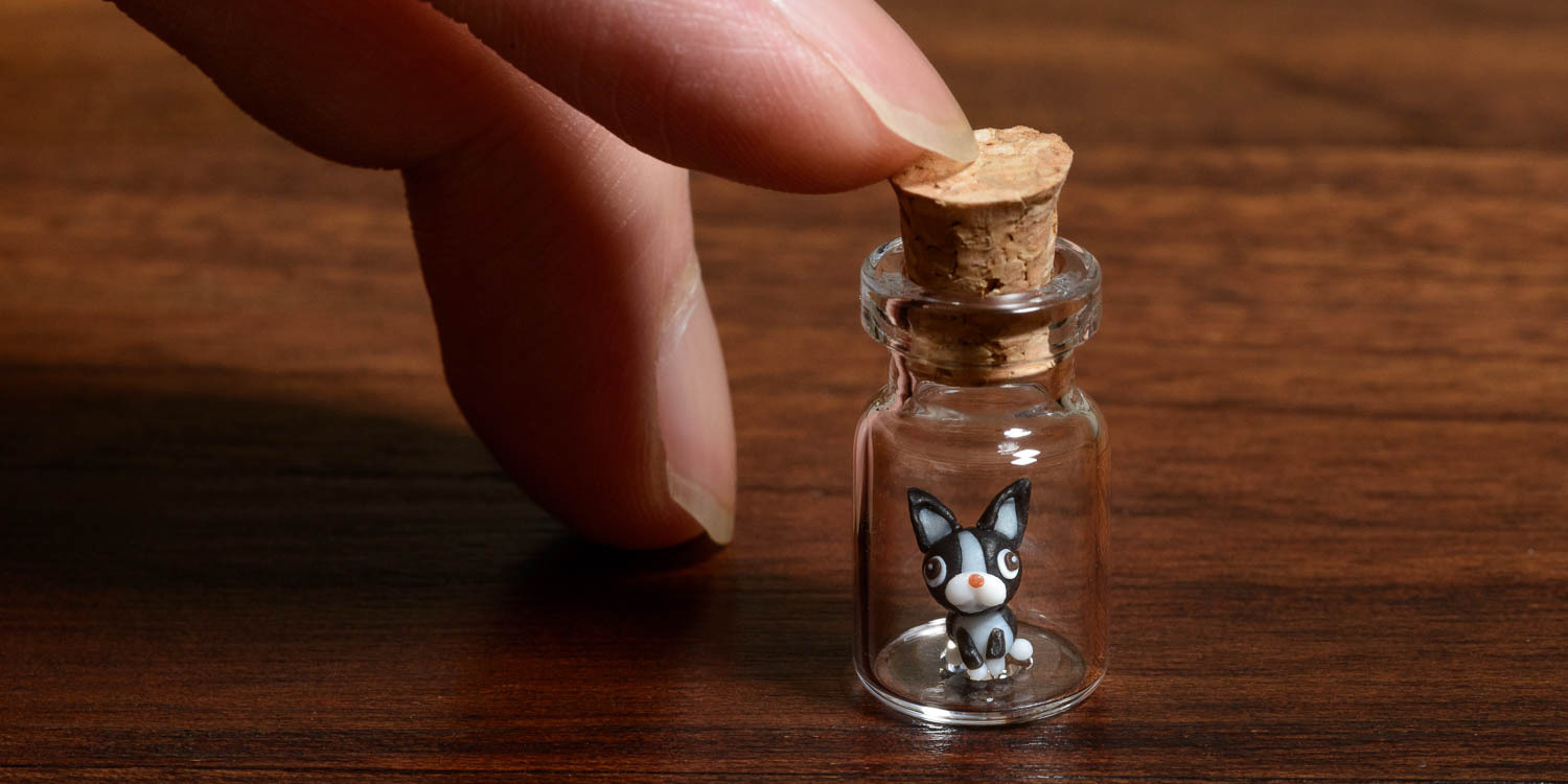 小指の先に乗るほど繊細な犬をガラスの小瓶に入れました。